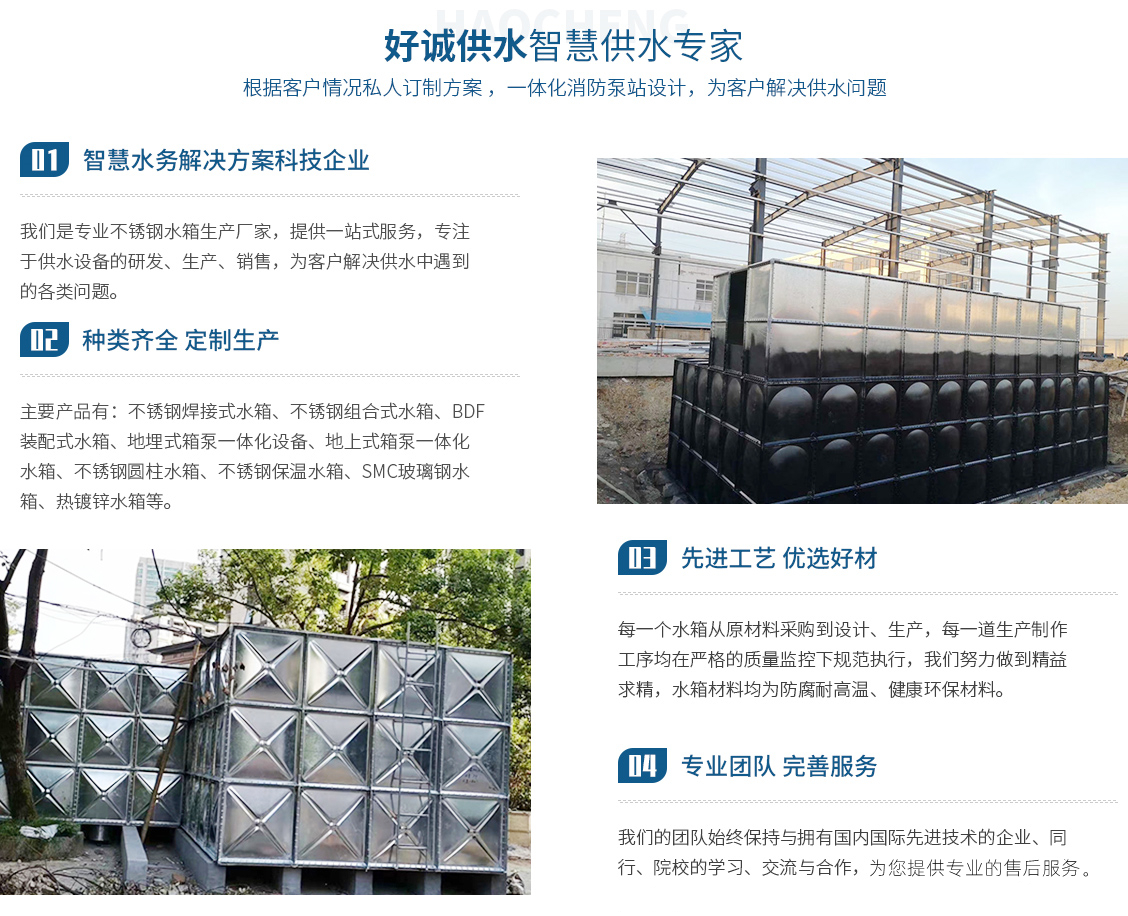 安徽好誠(chéng)供水設(shè)備制造有限公司是一家集設(shè)計(jì)、研發(fā)、制造、銷(xiāo)售、售后為一體的專(zhuān)業(yè)不銹鋼水箱生產(chǎn)廠家,以科技力量立足于社會(huì)。近幾年來(lái)致力于供水設(shè)備、水箱的研究與開(kāi)發(fā)。主要產(chǎn)品有:不銹鋼焊接式水箱、不銹鋼組合式水箱、BDF裝配式水箱、地埋式箱泵一體化設(shè)備、地上式箱泵一體化水箱、不銹鋼圓柱水箱、不銹鋼保溫水箱、SMC玻璃鋼水箱、熱鍍鋅水箱。對(duì)于傳統(tǒng)混凝土水箱的改造(即不銹鋼內(nèi)貼水箱),老舊水箱的拆除、更換、...